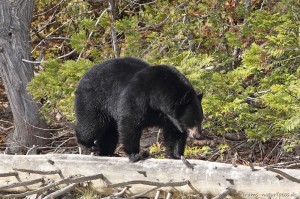 Am meisten beschäftigten uns auf der Resie die Bären. Nicht, weil wir andauernd welche sahen, dafür gab es Warnungen an fast jeder Straße, an Campingplätzen und Wanderwegen. Gerade auf den Wanderungen waren unsere Gefühle etwas zwiegespalten, wir wollten schon einmal einen Bär sehen, aber wenn einer überraschend aus dem Gebüsch gesprungen wäre - naja, da hatten wir schon etwas Angst. Die Bärenklingel war dabei, Bärenspray nicht. Meistens sahen wir aber nur Spuren, Kothaufen und eben jede Menge Warnschilder. Relativ am Ende der Reise, bei einer Bootsfahrt auf dem Mud Lake, klappte es dann. Wir sahen zwei männliche Schwarzbären, die am Ufer ganz entspannt nach Nahrung suchten.